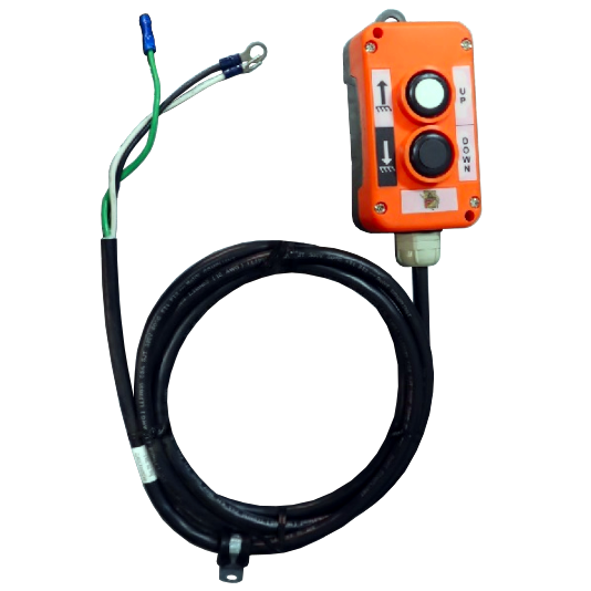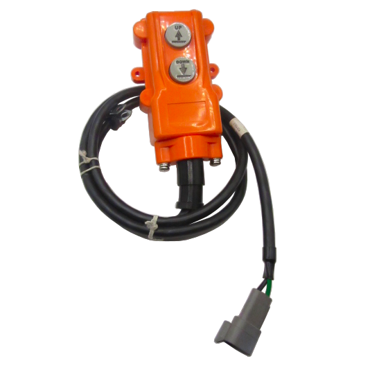 03240-3D-078 is a 3 wire harness with a 2 push button control box. The control box wire is made with an oil resistant jacket, ideal for hydraulic fluid environments. This control is designed for single acting power units. The 03240 is weather proof and has a safety interlock preventing both buttons from being depressed at the same time.