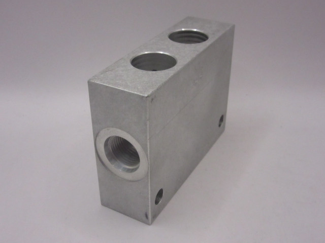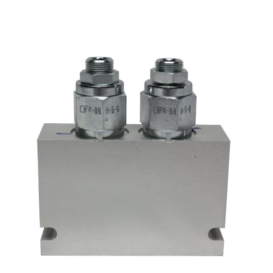 This is a dual counterbalance valve, poppet type, free reverse flow with cross line checks. This inline manifold features #8 counter balance cartridges, Buna N seals, leak proof adjustment screws are adjustable from 300-3000 psi, and #8 ports.