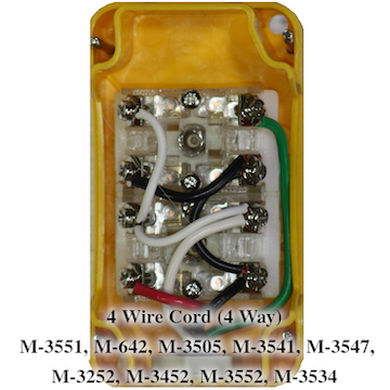 17720 is a 4 wire harness with a 2 push button control box. The control box wire is made with an oil resistant jacket, ideal for hydraulic fluid environments. This control is designed for double acting power units. The 17720 is weather proof and has a safety interlock preventing both buttons from being depressed at the same time.